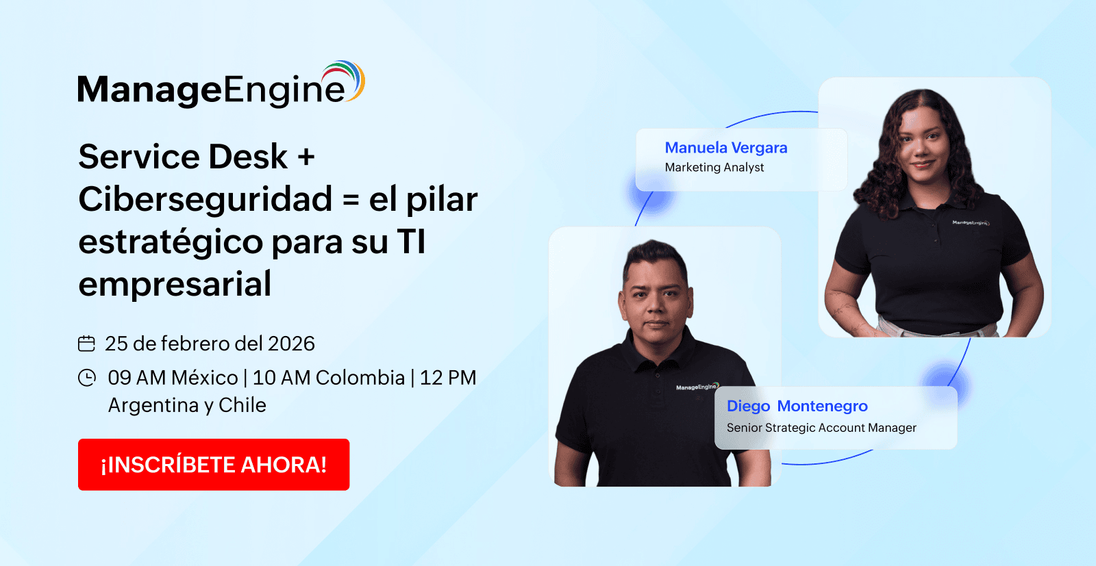 ¡Inscríbase ahora! Nos encontraremos el próximo 25 de febrero a las 9 AM en México, 10 AM en Colombia, 12 PM Argentina y Chile. Será un webinar completamente gratuito con el que podrá llevar su service desk al siguiente nivel gracias a la ciberresiliencia.[h1] Service Desk + Ciberseguridad = el pilar estratégico para su TI empresarial